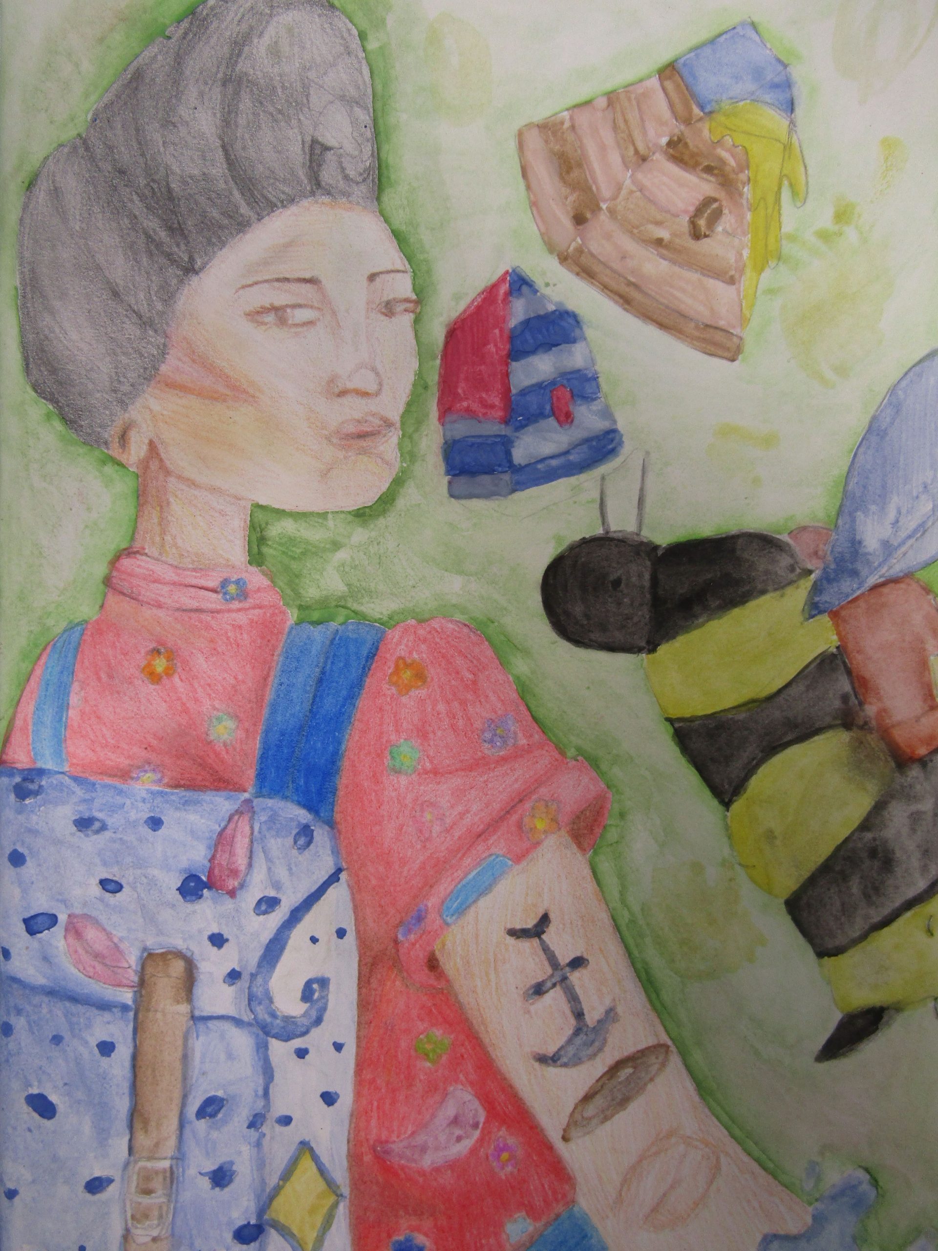 Coloured pencils, water colours, oils pastels and pen, 29cm x 21cm
