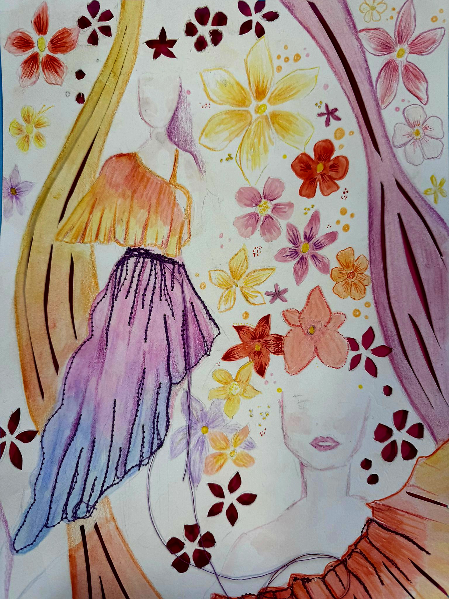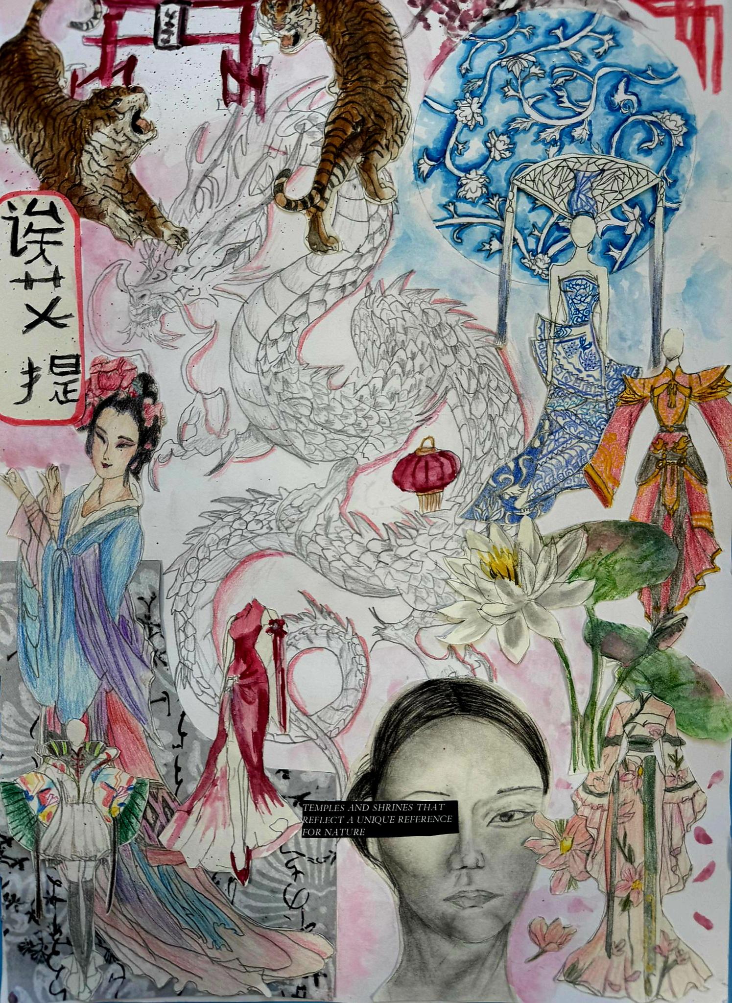 Water colour, coloured pencil & paper cutting, 30cm x 21cm