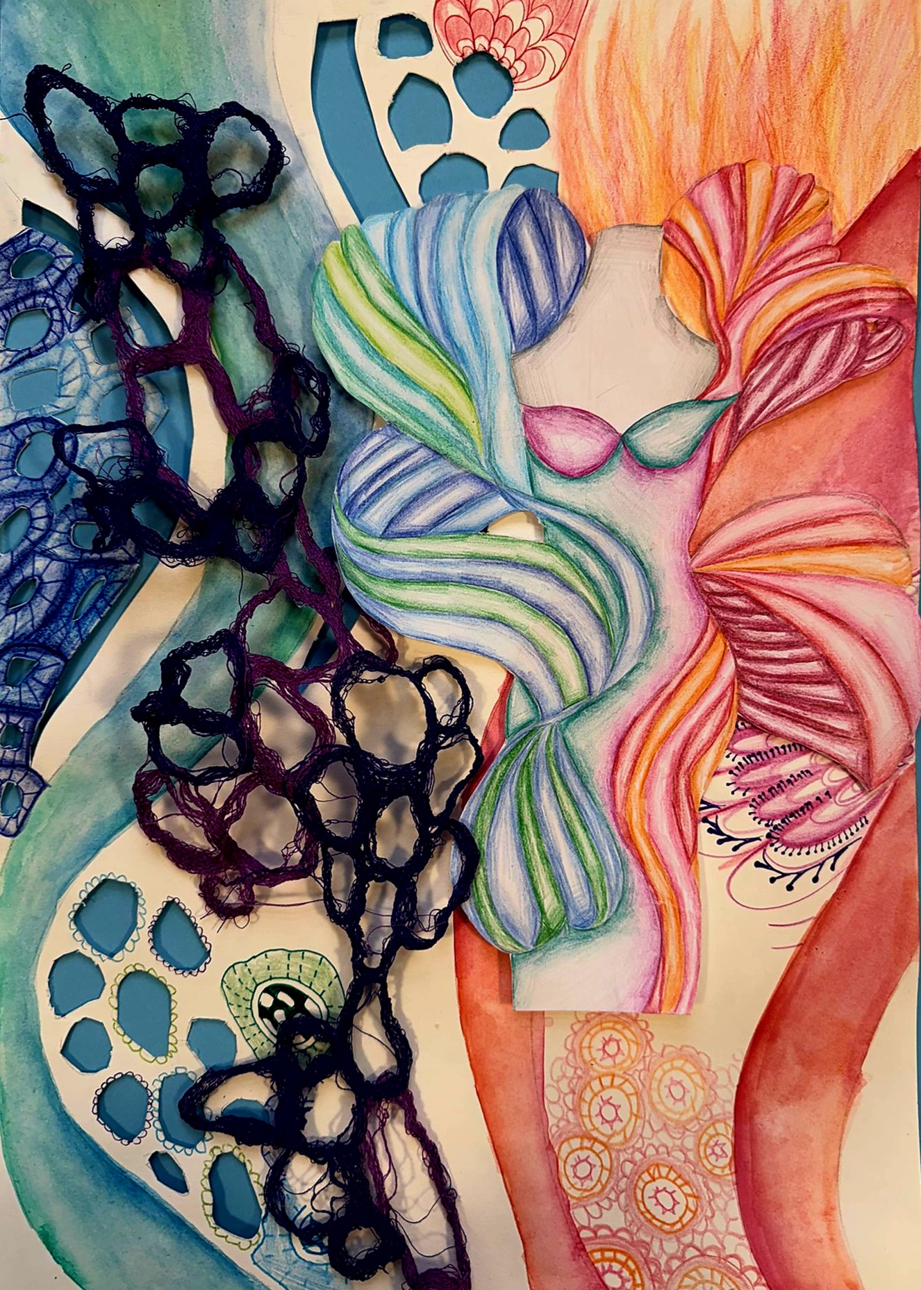 Mixed Media watercolour, papercutting & stitch, 42cm x 529cm